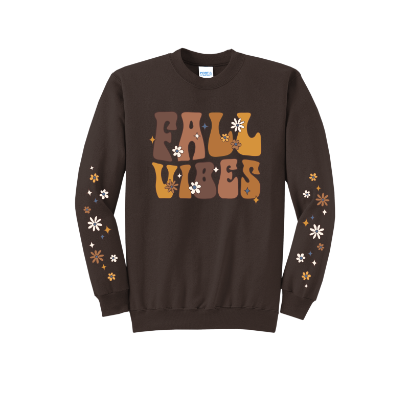 Brown crewneck sweatshirt with the phrase 'FALL VIBES' in large, retro-style orange and brown letters on the front. The sleeves feature white, yellow, and brown floral patterns.